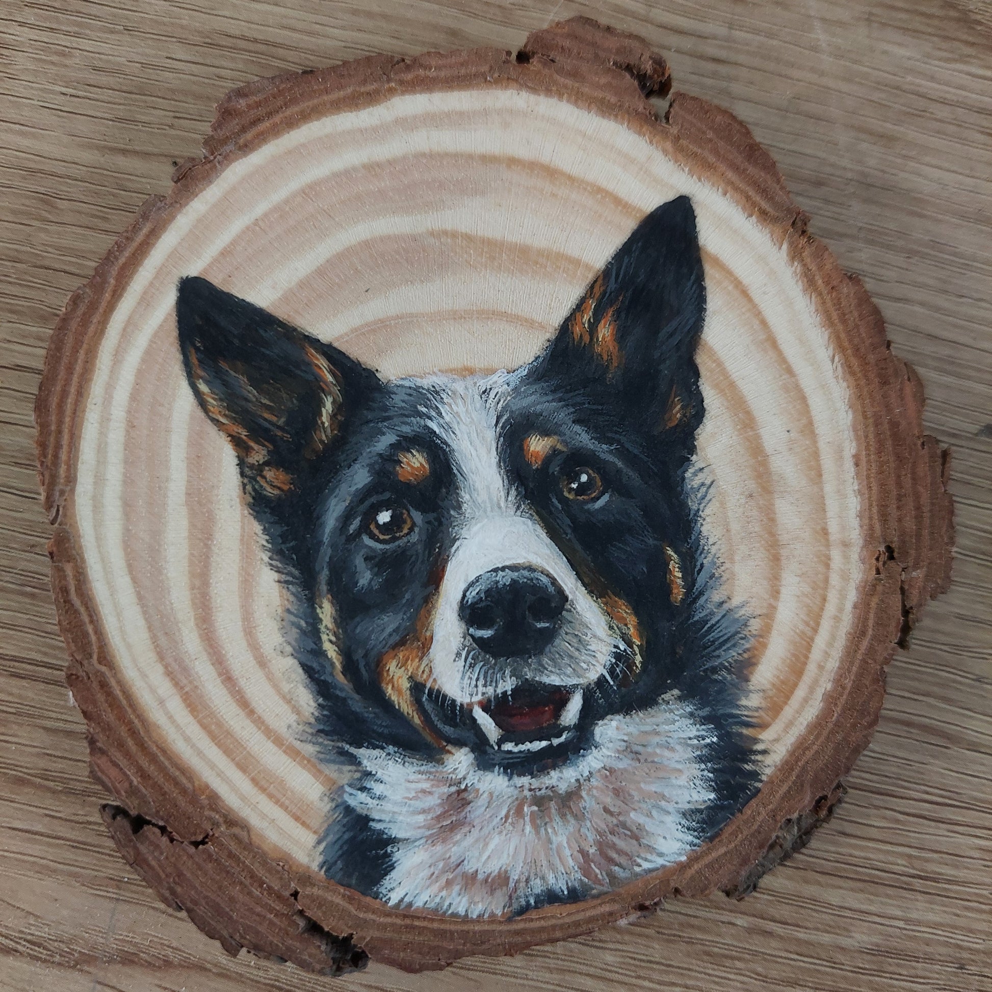 A custom pet portrait on a rustic log slice, painted with acrylic and sealed.