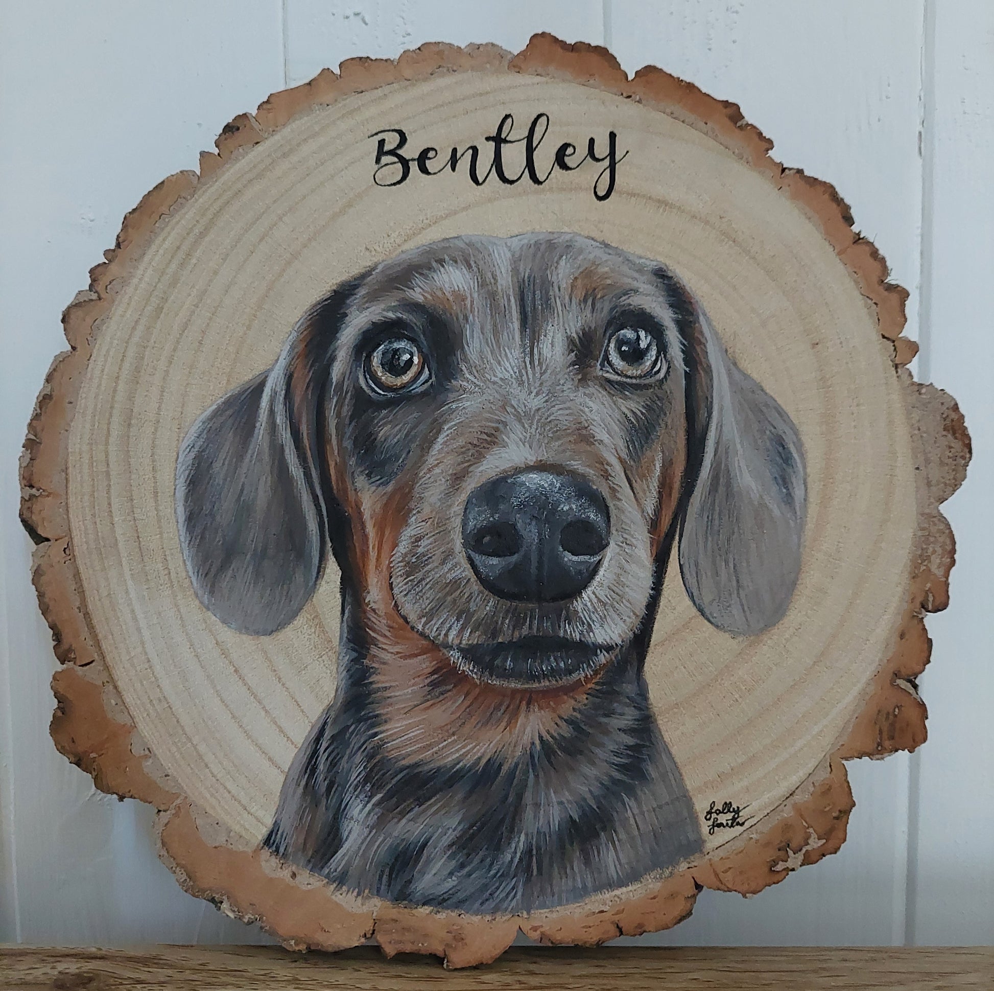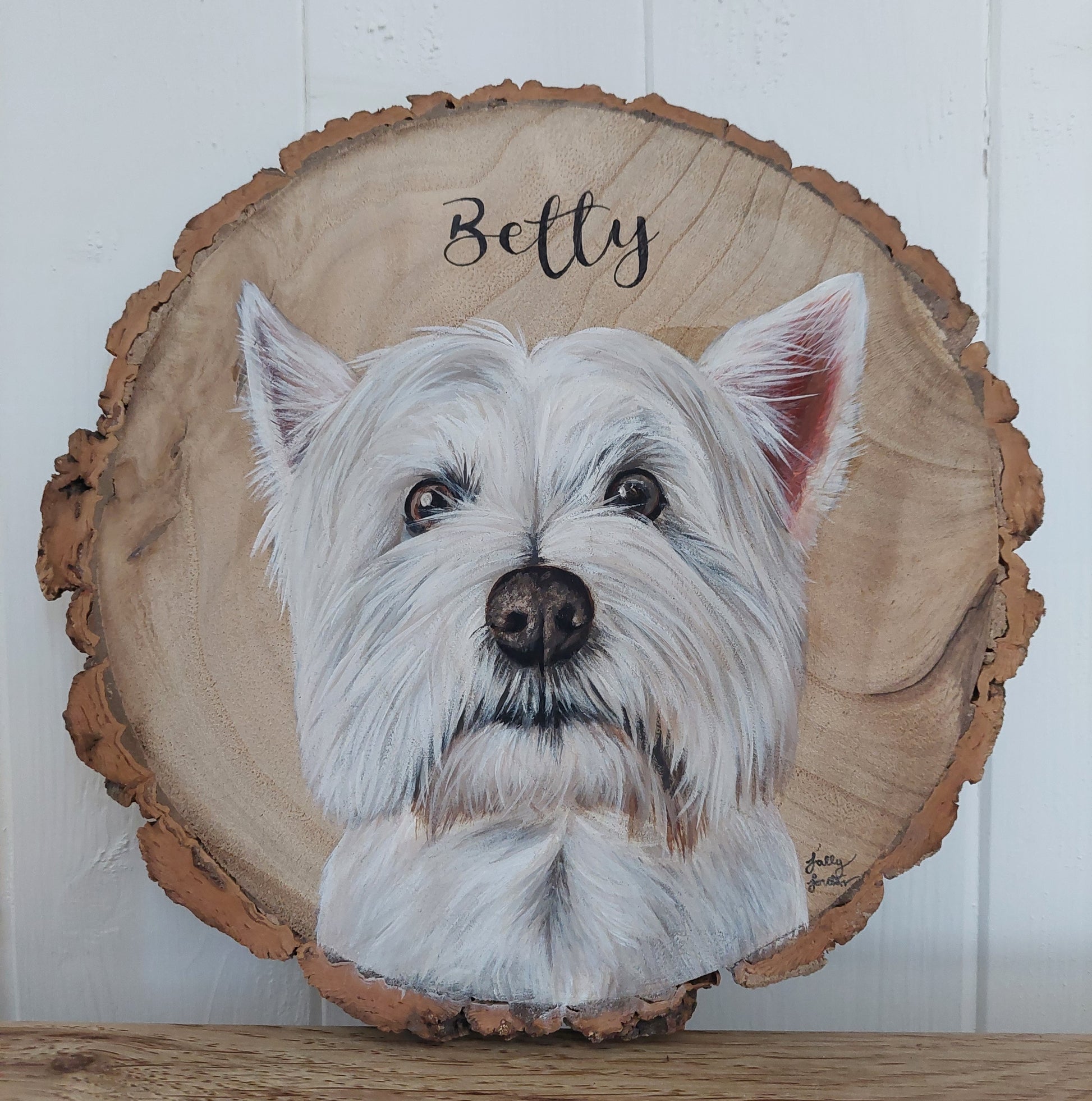 A custom pet portrait on rustic wood painted with acrylic and sealed.