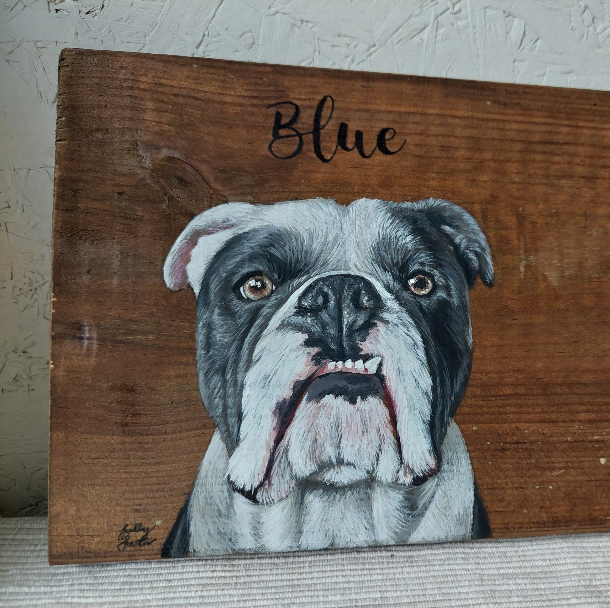 A custom pet portrait on rustic wood painted with acrylic and sealed.